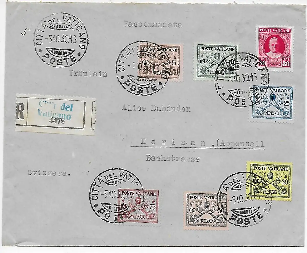 Lettre recommandé au Vatican par Herisan/Suisse, 1930