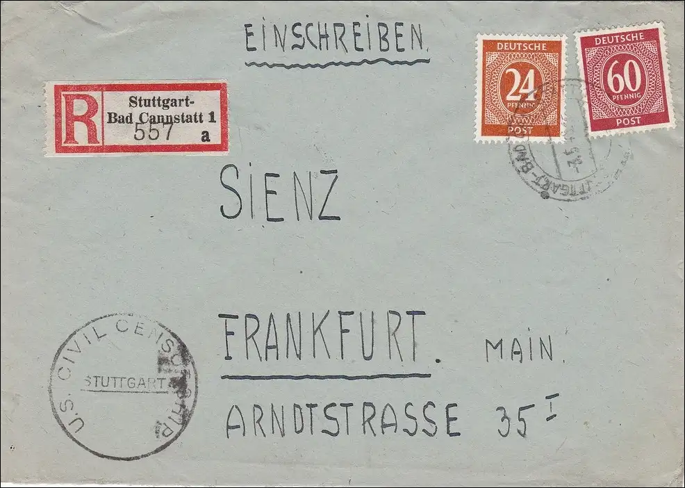 Lettre recommandé de Stuttgart, Bad Cannstatt après Francfort 1946 - censure US