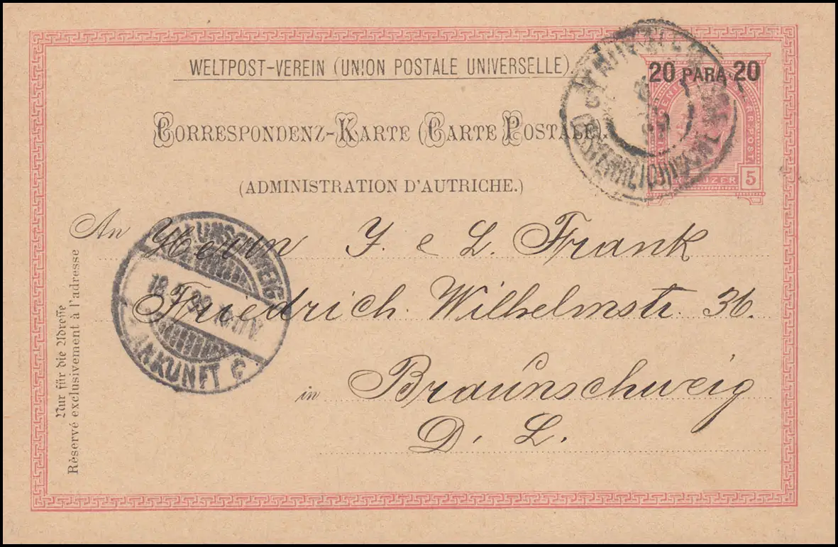 Tampon JÉRUSALEM POSTAUTRIQUE 1899, Templier d'arrivée BRAUNSCHWEIG 18.5.1899 Numéro de catalogue: P12a Test: original Référence produit: 00000000026828>P>Note: Cet article n'est disponible qu'une seule fois. Vous recevrez exactement l'article représenté.