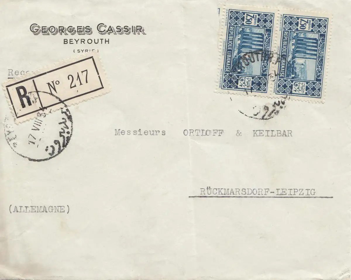 Liban: 1954: Registered Beyrouth to Rückmarsdorf/Leipzig