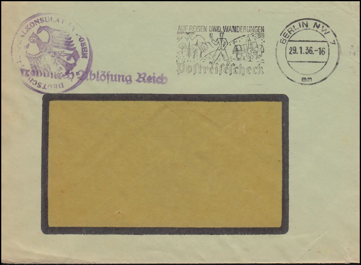 Timbre de correspondance DEUTSCHES CONSULAT GÉNÉRAL À POSEN, A propos du Bureau des postes du ministère des Affaires étrangères W.8, Enveloppe de lettre de fenêtre, Timpos publicitaire: En voyage et randonnée Chèque de voyage de poste Vérification: original Référence: 00000000034945>Remarque: Cet article n'est disponible qu'une seule fois. Vous recevrez exactement l'article représenté.
