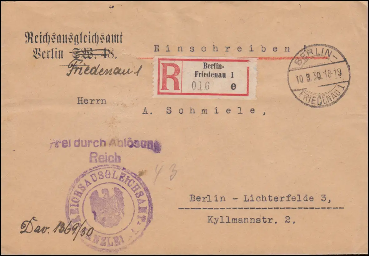 Libre par remplacement Office de péréquation des Reichs R-Lettre BERLIN-FRIEDENAU 10.3.1930