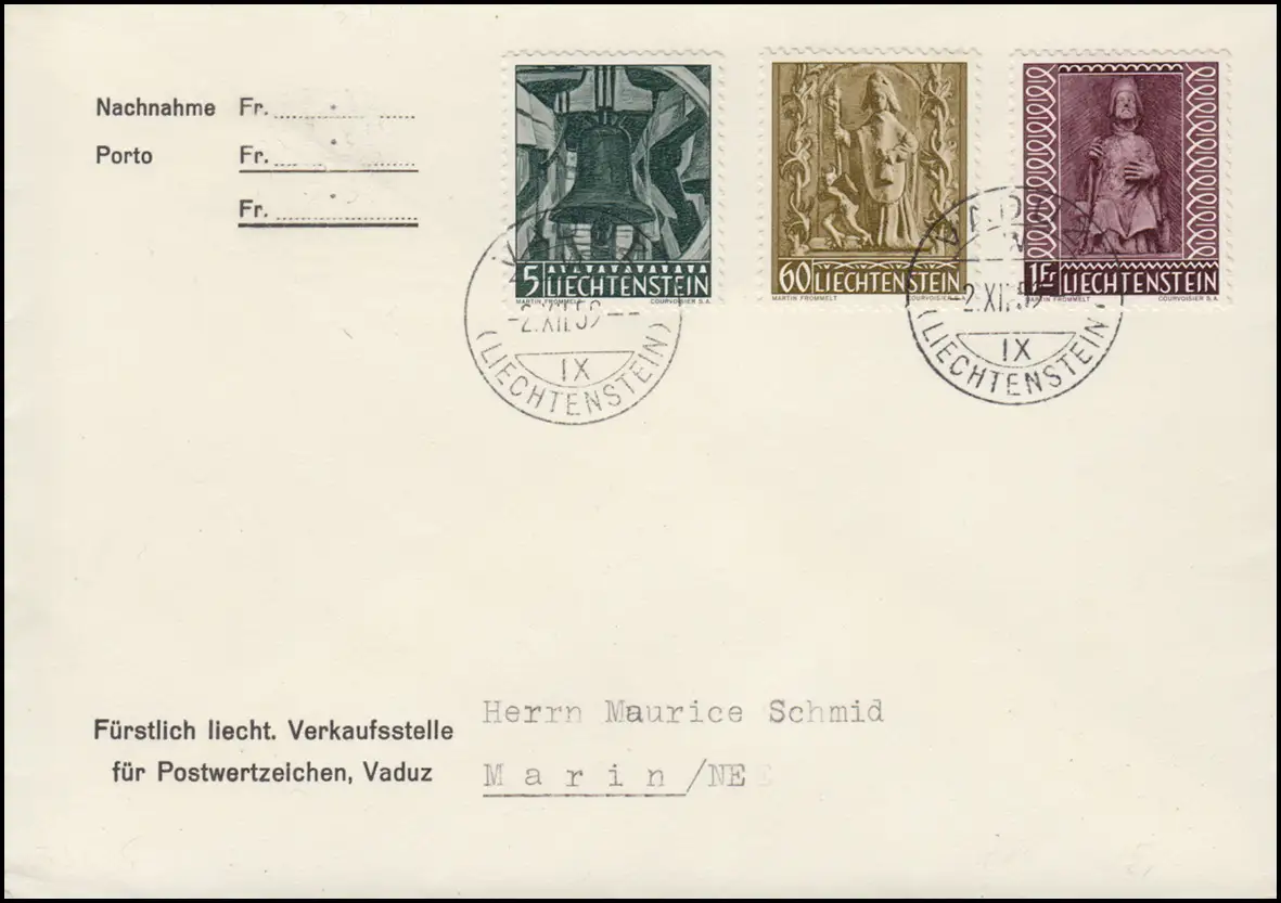 Chaise gloque, plastique de cloche, plastique tour, timbre d'arrivée MARIN NE 4.12.59 Numéro de catalogue: 386-388 Examen: original Référence produit: 00000000019971