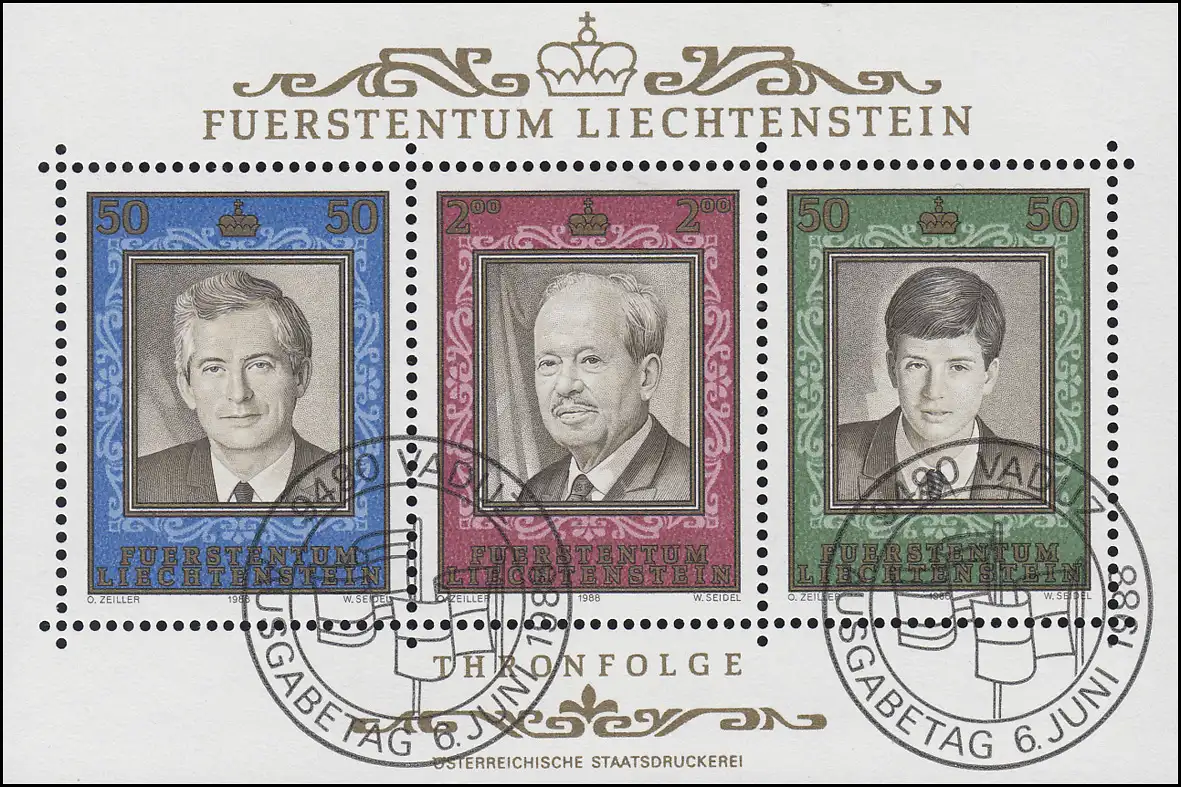 Liechtenstein bloc 13 Ascension du trône du prince Franz Joseph II, ESSt 6.6.1988