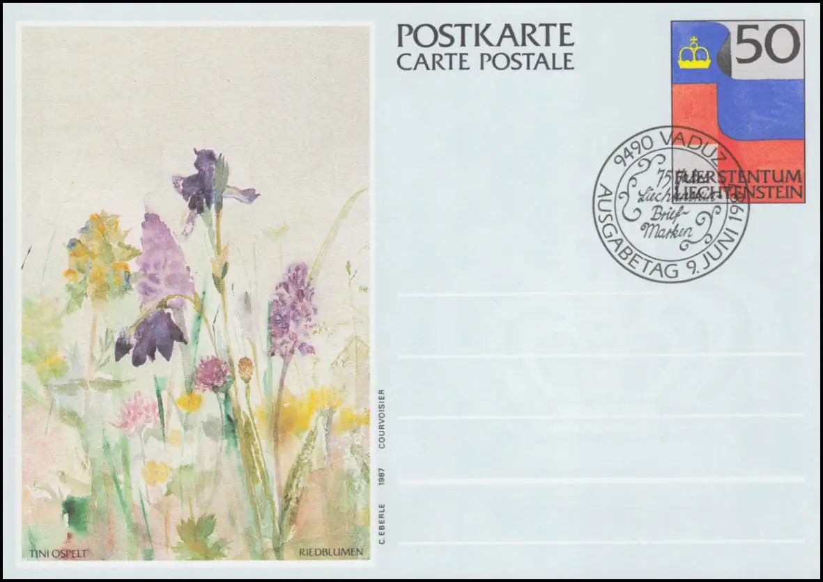 Liechtenstein Carte postale P 85 Drapeau: Riedflumen, ESSt VADUZ 9.6.1987