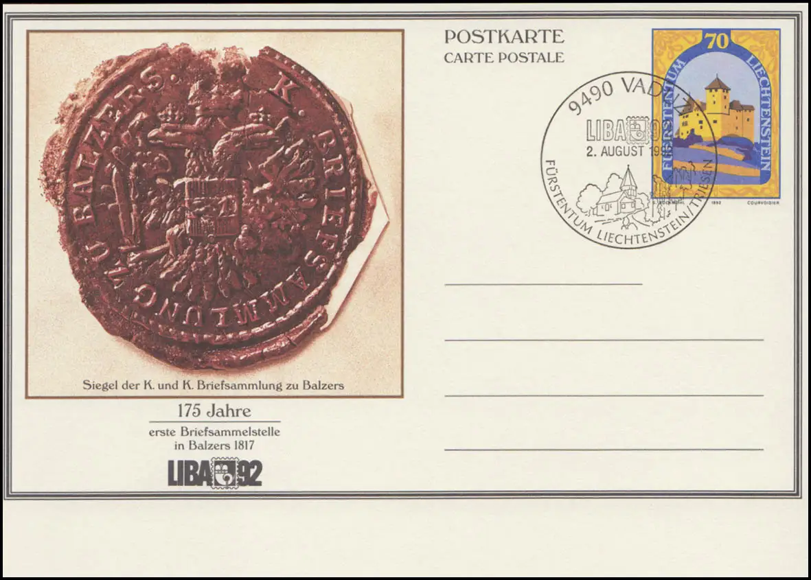 Carte postale spéciale pour l'exposition aux timbres LIBA'92: 175 ans premier centre de collecte de lettres à Balzers 1817, ESSt approprié VADUZ - LIBAC' 92 - août 1992 N° de catalogue: P90 Examen: original Numéro d'article: 81151009001201>Attention: Cet article est ou a été disponible plusieurs fois. L'illustration montre l 'un de ces articles exemplaire. La marque fournie a uniquement les caractéristiques indiquées dans la description et peut donc différer de l ’ illustration. Toutefois, en particulier pour les marques marquées, nous nous efforçons de fournir l\'élément représenté. Si cela vous convient, veuillez nous le faire savoir.