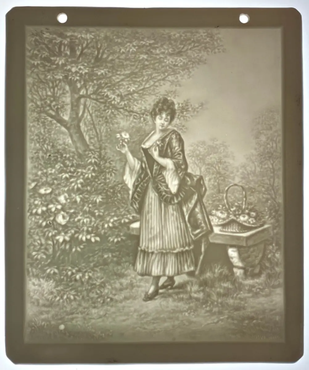 Cette pièce représente une femme dans un jardin, tenant une rose, avec un panier de fruits à proximité. Le style de la robe et le cadre naturel romantique suggèrent une origine victorienne ou Belle Époque.