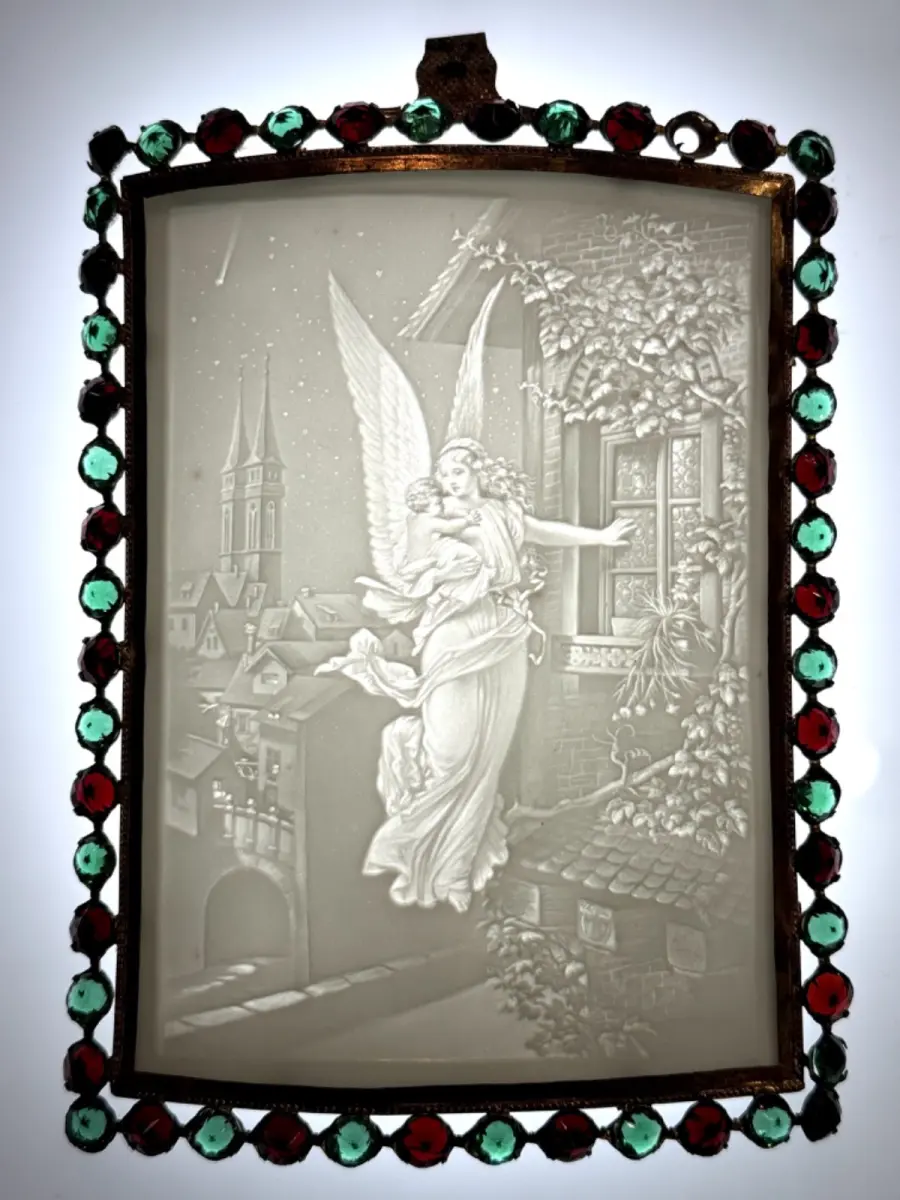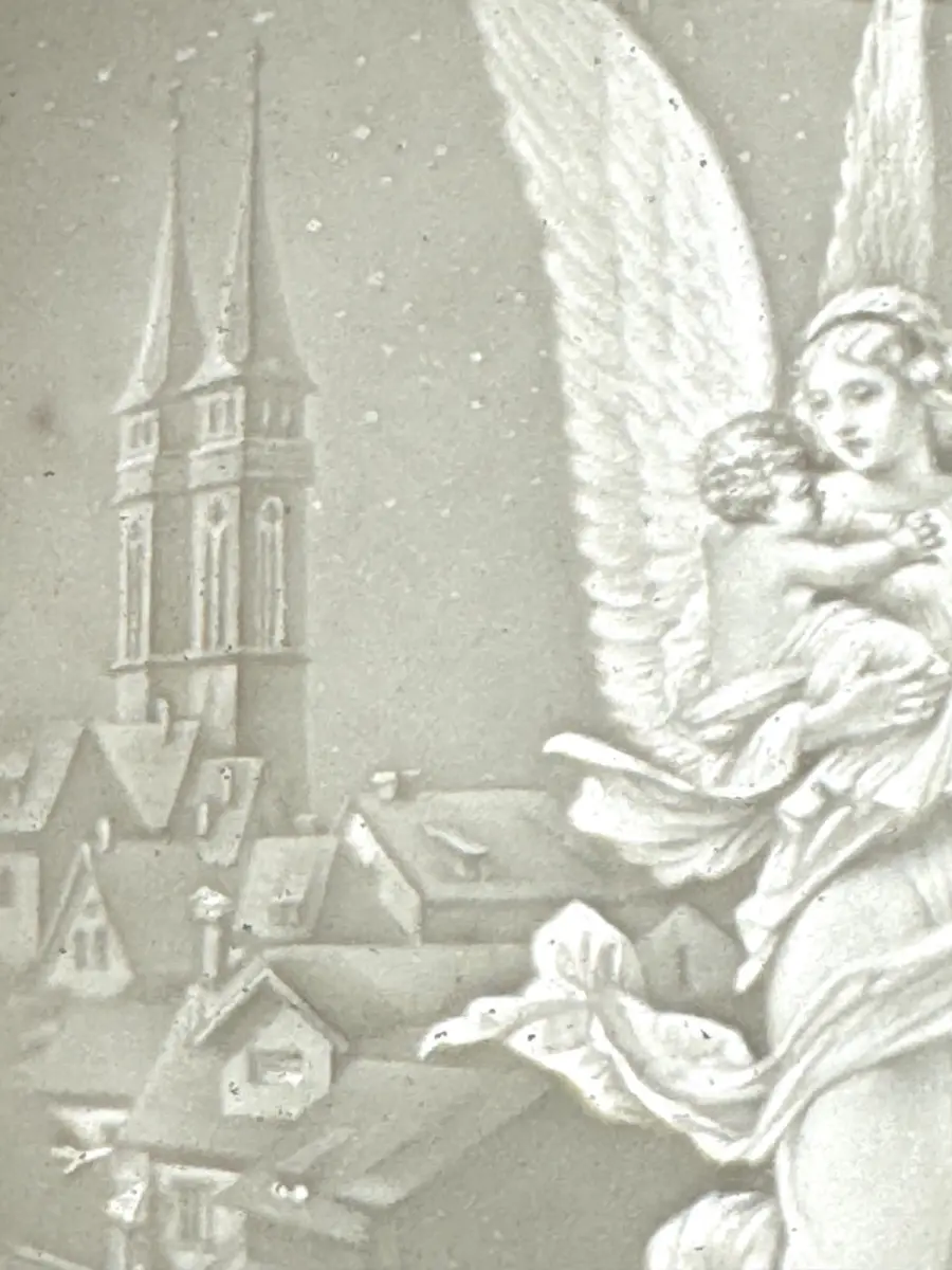 Un ange tient dans ses bras un enfant. Elle descend d'un ciel étoilée et pousse la fenêtre à vitraux d'une maison dans un décor de ville. On distingue les clochers d'une cathédrale au second plan.