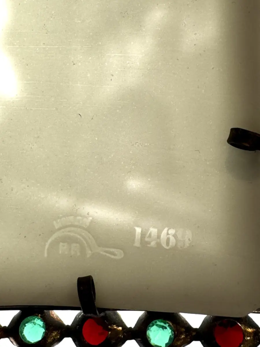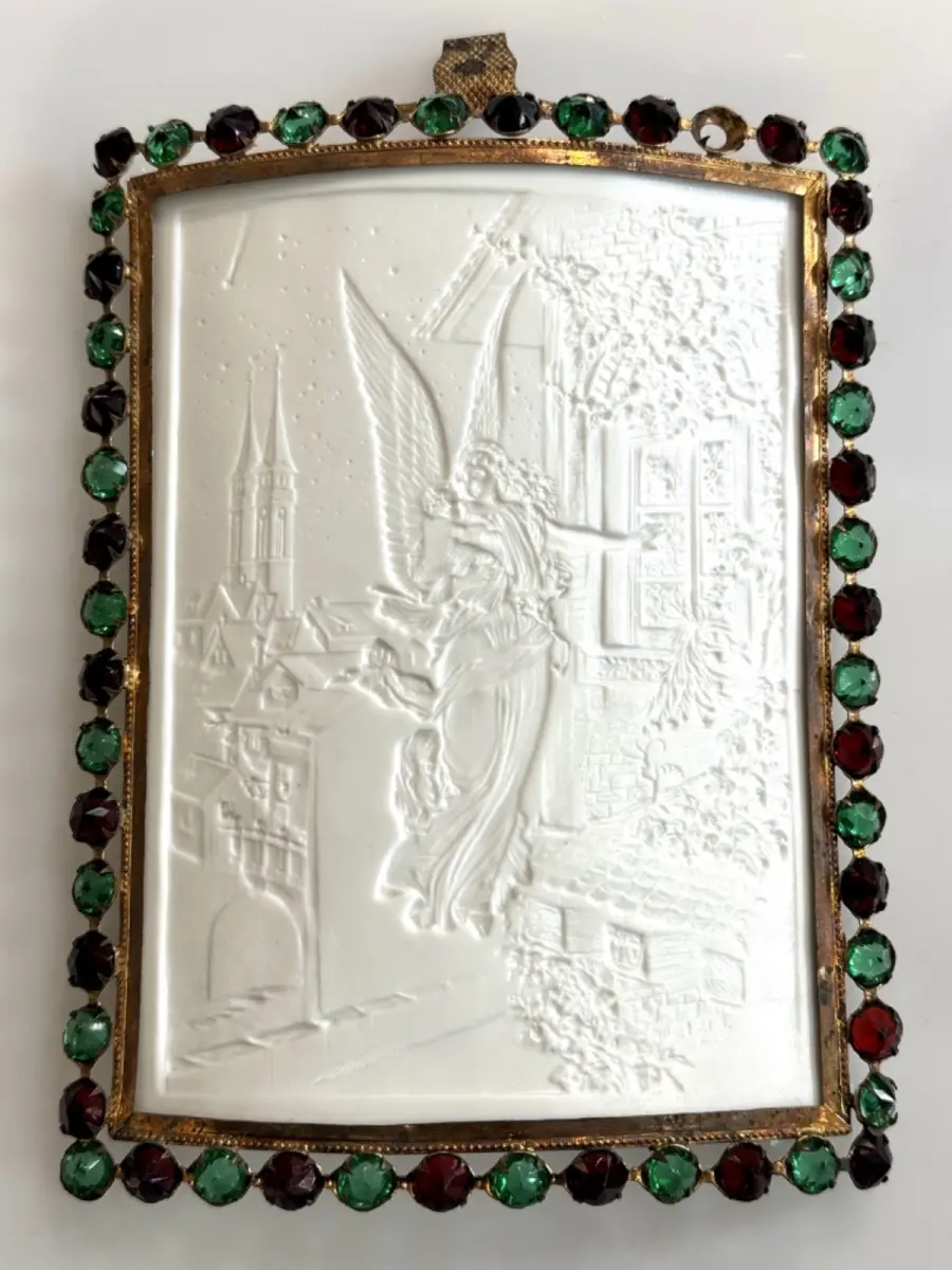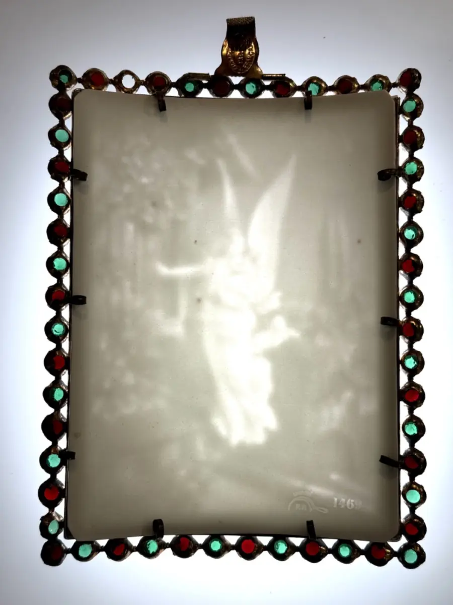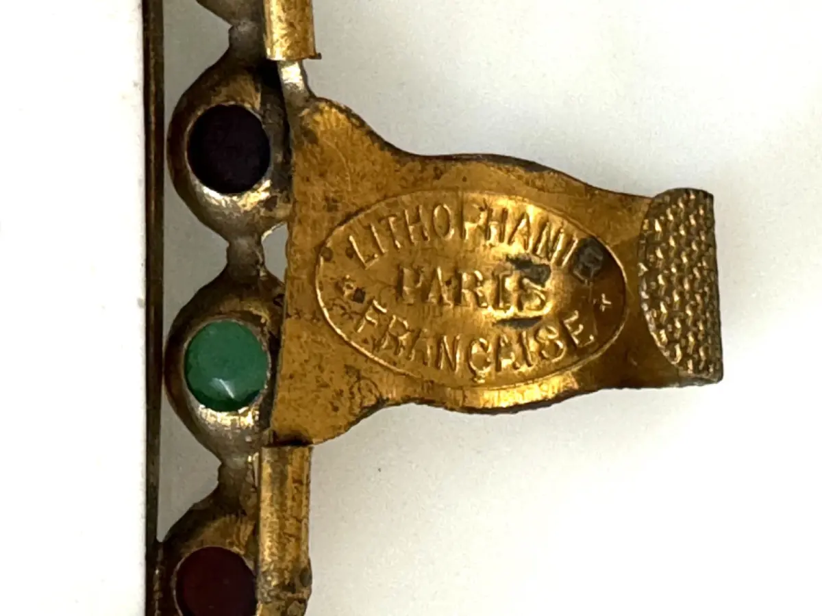 Lithophanie convexe avec inscription PP 146 au dos signifiant Porcelaine de Paris, sertie de strass verts et roses avec attache en laiton.