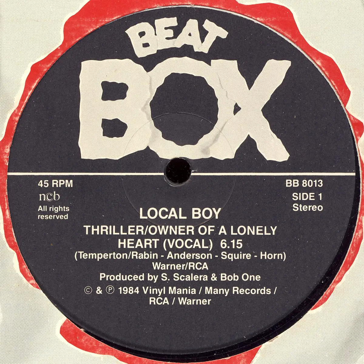 12" Maxi Local Boy - Thriller / Owner Of A Lonely Heart, unité de la société de disques avec autocollants, d'état plaque VG enveloppe VD; Fabriqué en Suède 1984 Beat Box BB 8013, Tracks [Vocal] 6:15, [Inst.]