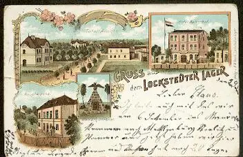Lockstedter Lager. Gruss aus, Totalansicht, Hotel Kaiserhof, Bismarkdenkmal, Hauptwache. - Gelaufen 1900. (NPLZ 25551).