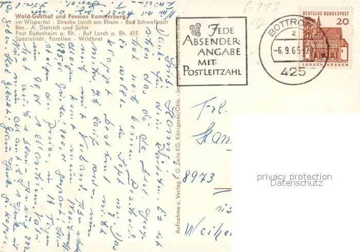 Lorch_Rheingau Waldgasthof Pension Kammerburg im Wispertal Lorch Rheingau postalisch gelaufen 1965 Erhaltung siehe scans [FriedD77] Frierer