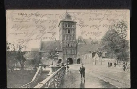 Lübeck. Burgtor - Gelaufen. 1916. Wasserschaden. Vorderseite von der Rückseite z. Teil abgetrennt. (NPLZ 23500) Posiadamy rowniez konto zlotowkowe w Polsce.