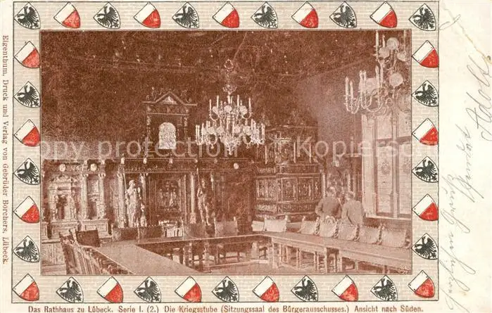 Luebeck Rathaus Kriegsstube Sitzungssaal Buergerausschuss Kronleuchter Wappen Luebeck postalisch gelaufen 1902 Erhaltung siehe scans [FriedD77] Frierer