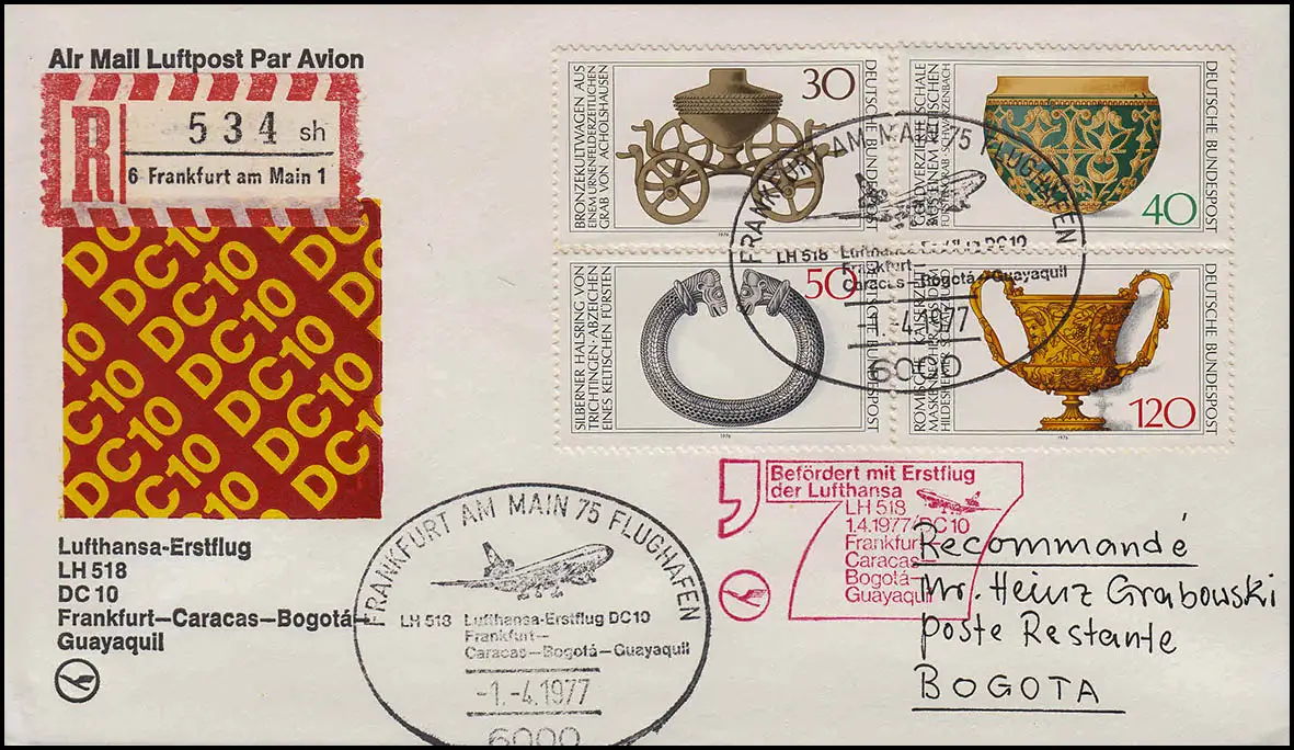 Lufthansa Premier vol R-Lettre DC 10 LH 518 Frankfurt Main/Bogota 1.4.1977