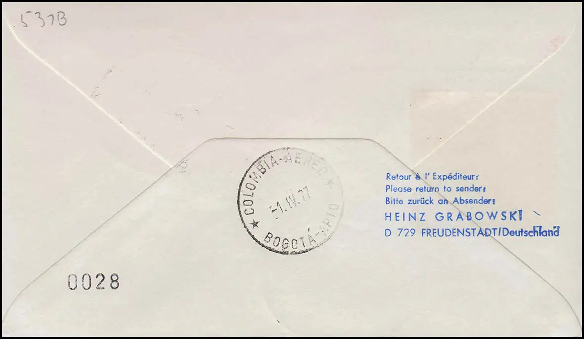 Tampon rouge avant transporté avec premier vol de Lufthansa LH 518 1.4.1977 DC10 Frankfurt - Caracas - Bogota - Guayaquil. Temporaire d'arrivée Colombia - Aereo Bogotá Apto. Stampeau 0028. Vérification: original Référence produit: 00000000019922