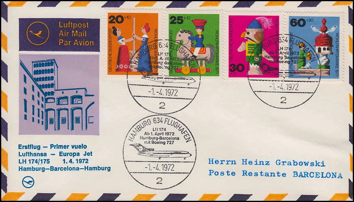 Lufthansa Premier vol LH 174/75 Boeing 727 Europa Jet HAMBURG / BARCELONA 1.4.1972