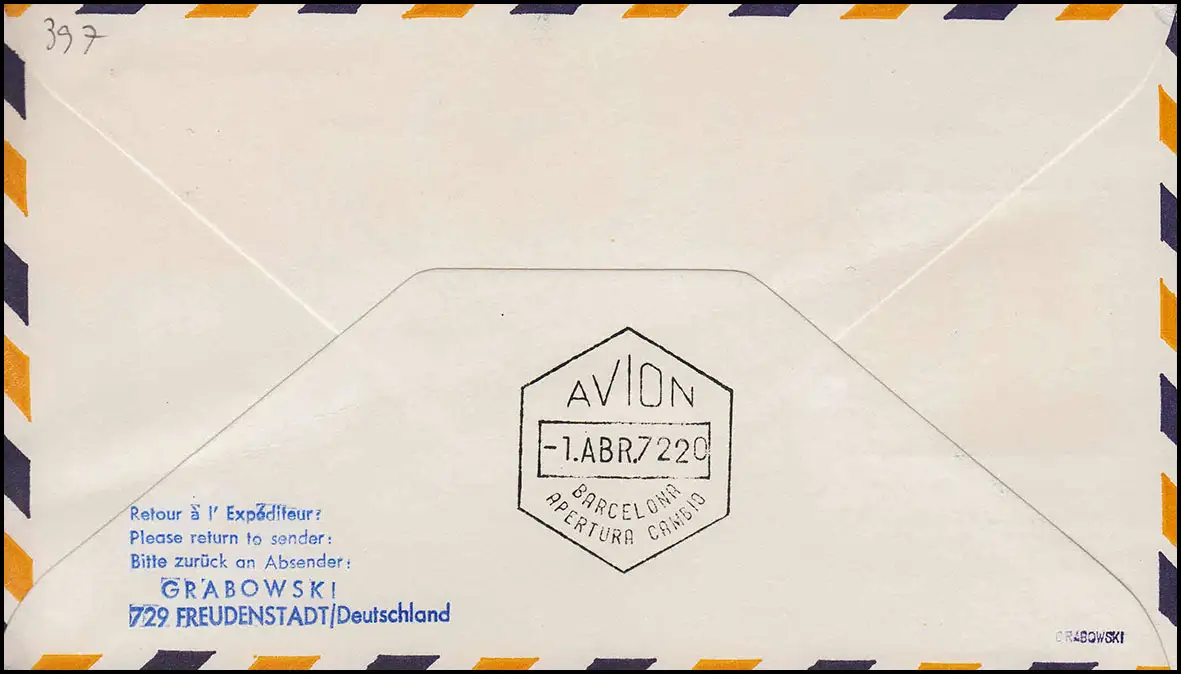 Au dos Tampon hexagonal d'arrivée AVION Barcelona Apertura Camcio 1. Abr 72 Vérification: original Référence produit: 00000000028265>Note: Cet article n'est disponible qu'une seule fois. Vous recevrez exactement l'article représenté.