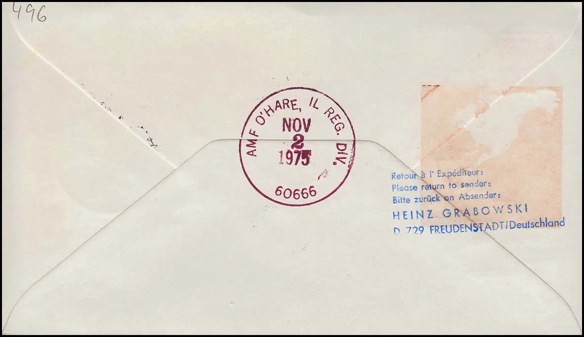 Porté avec cachet en bleu avant, retour en violet, verso Tampon d'arrivée AMF O'HARE, IL REG. DIV 60666 en rouge foncé. Contrôle: original Référence produit: 00000000010359
