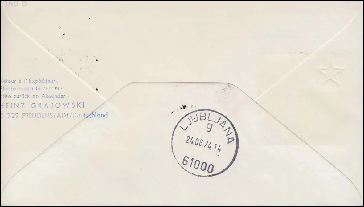 Tampon pourpre avec les données de vol sur le devant, au verso Template d'arrivée dans LJUBLJANA 61000 24.6.74 Vérification: original Référence produit: 00000000047792>Note: Cet article n'est disponible qu'une seule fois. Vous recevrez exactement l'article représenté.