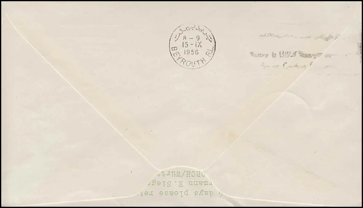 Tampon de transport au recto de la ROT, au verso Temporaire d'arrivée BEYROUTH R.L. Contrôle: original Référence produit: 00000000010022>Note: Cet article n'est disponible qu'une seule fois. Vous recevrez exactement l'article représenté.
