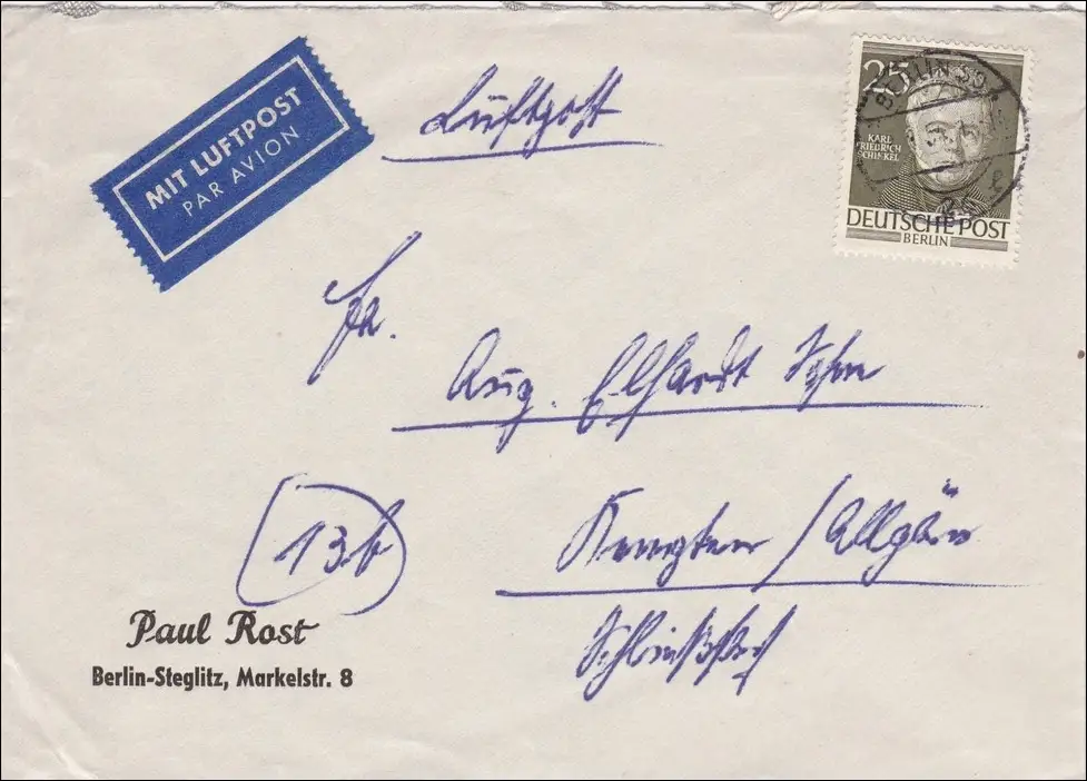 Lettre postale aérienne de 1954 à Kempten