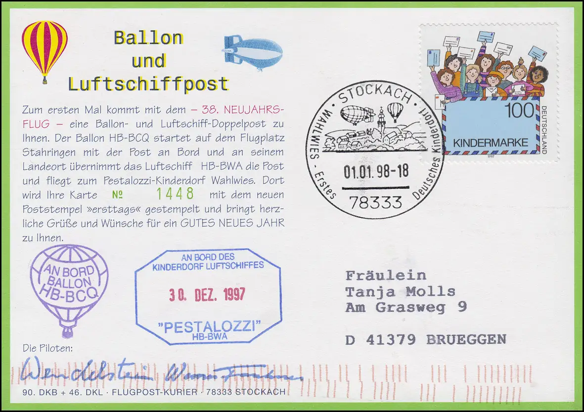 Poste de dirigeable DKL 46 HB-BCQ et PESTALOZZI 38e vol de nouvel an STOCKACH 1.1.1998