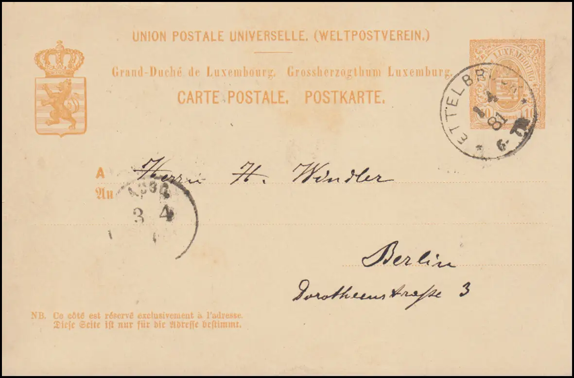 Luxembourg Carte postale P 32 ETTELBRUCK 1.4.1881 vers BERLIN Encerclement AUSG 3.4.