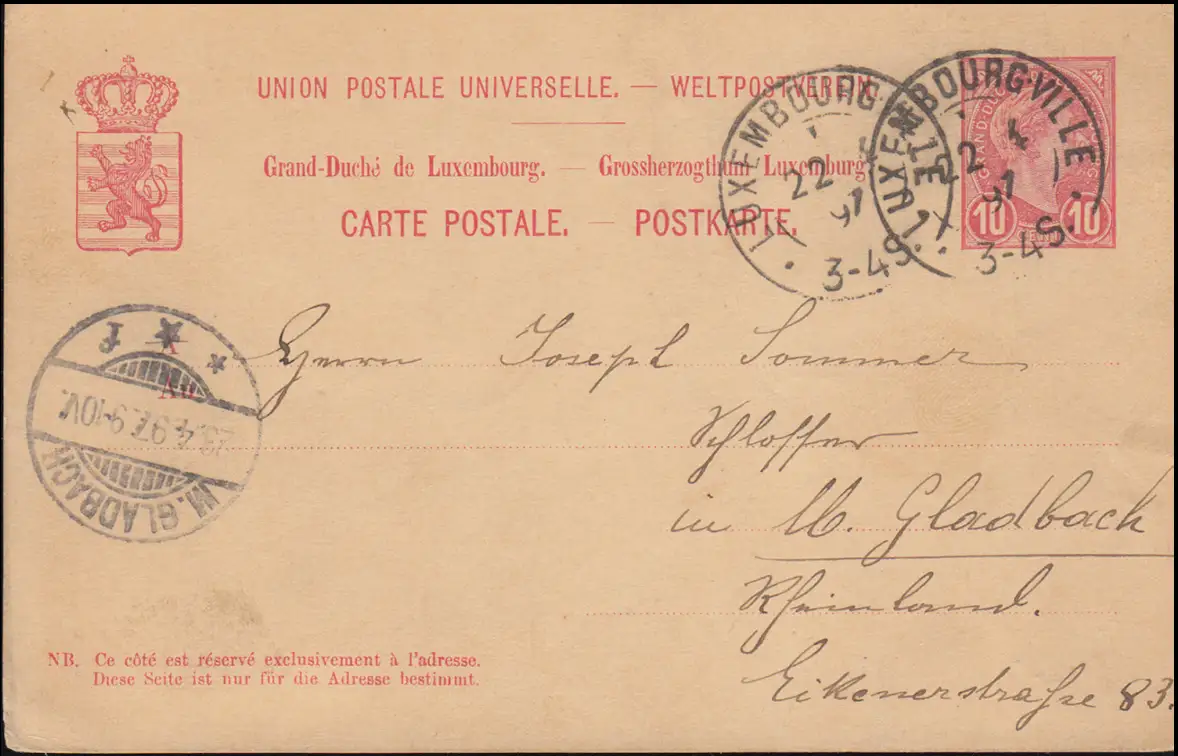 Luxembourg Carte postale P 54 LUXEMBOURG-VILLE 22.4.1897 vers MÖNCHENNGLADBACH 23.4.