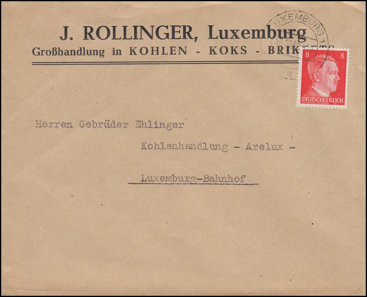 Luxembourg Hitler-EF 8 Pf Commerce du charbon Briquettes à coke Lettre locale LUXEMBOURG 1942