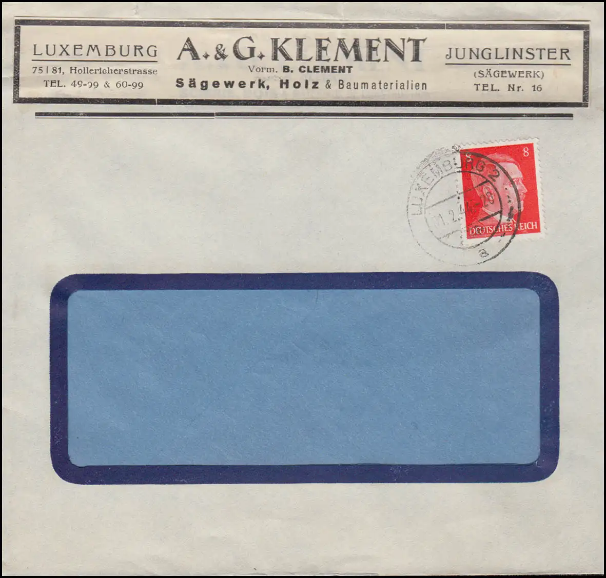 Luxembourg Hitler-EF 8 pf. facture scierie bois Clement Luxembourg, Bf Tages-O