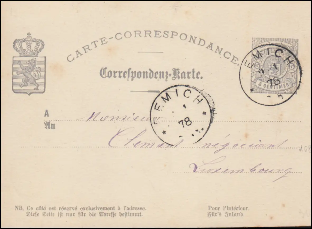 Luxembourg Carte postale P 20 EMICH 9.1.1878 vers LUXEMBOURG 9.1.1 1878