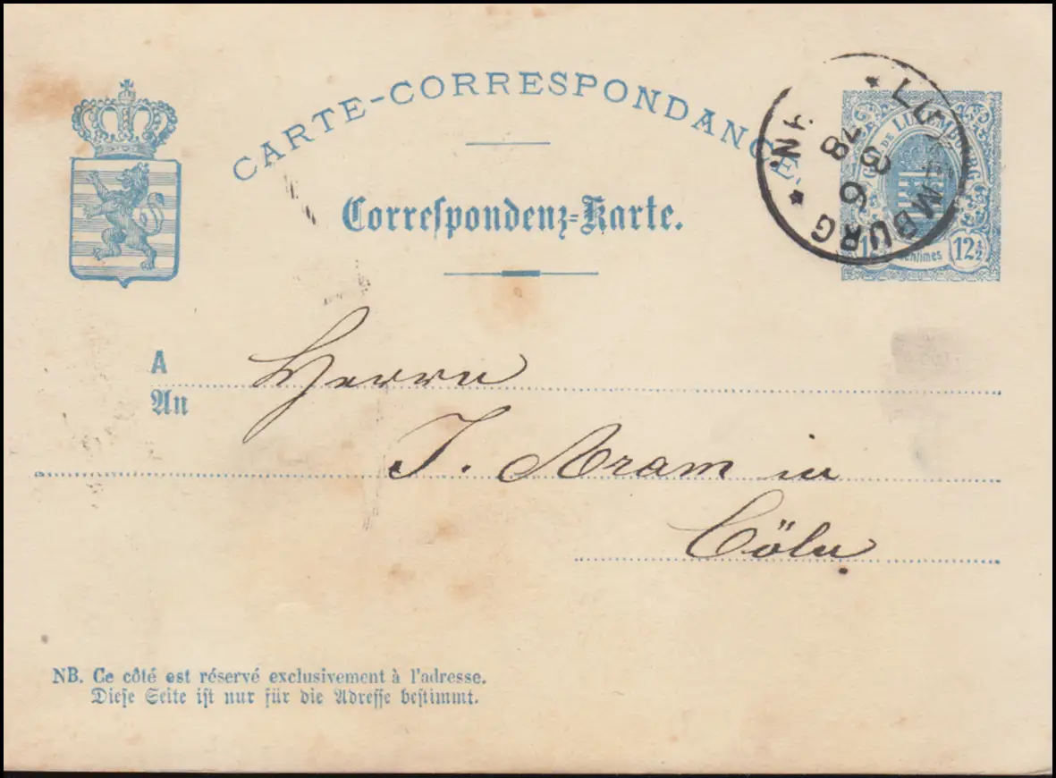 Luxembourg Carte postale P 23 LUXEMBOURG 3.6.1878 vers Cöln / Cologne