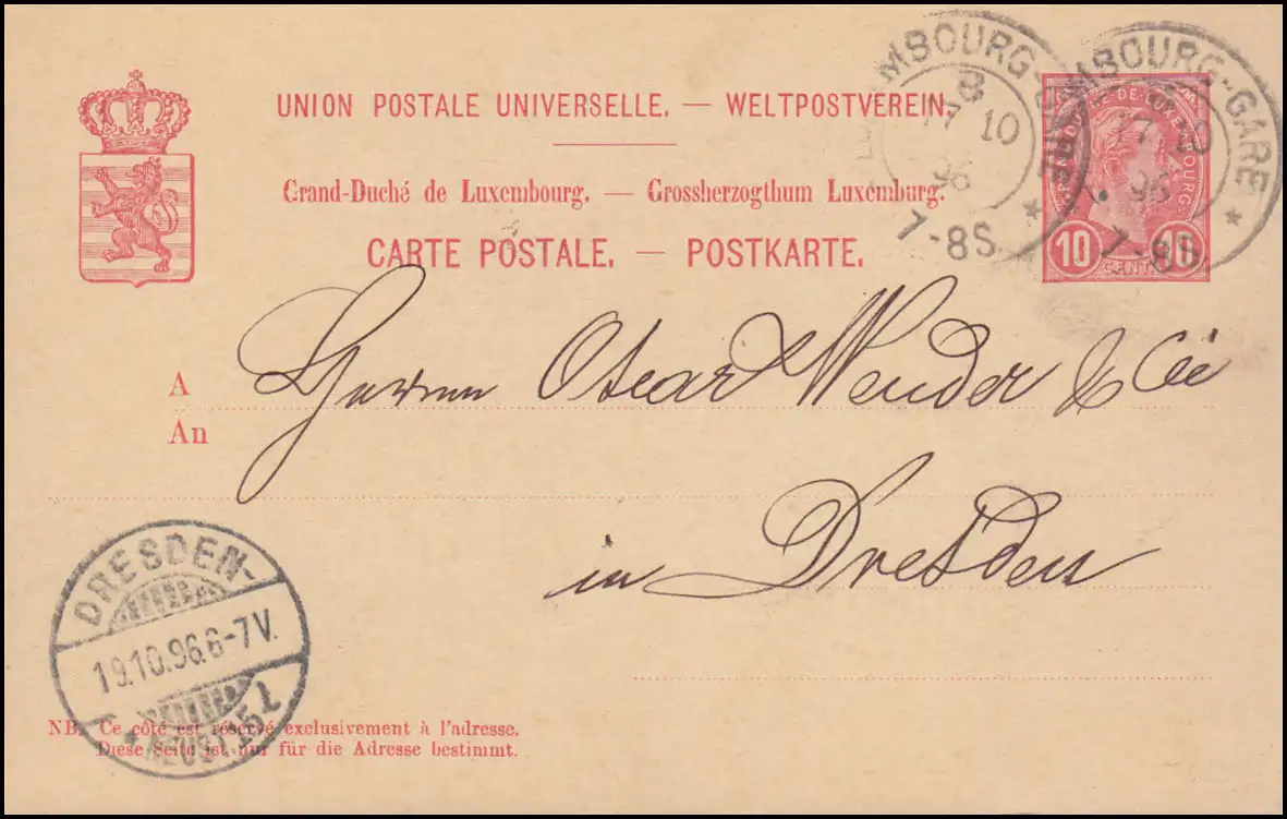 Luxembourg Carte postale P 54 de LUXEMBOURG-GARE 17.10.1896 vers DRESDEN 19.10.96