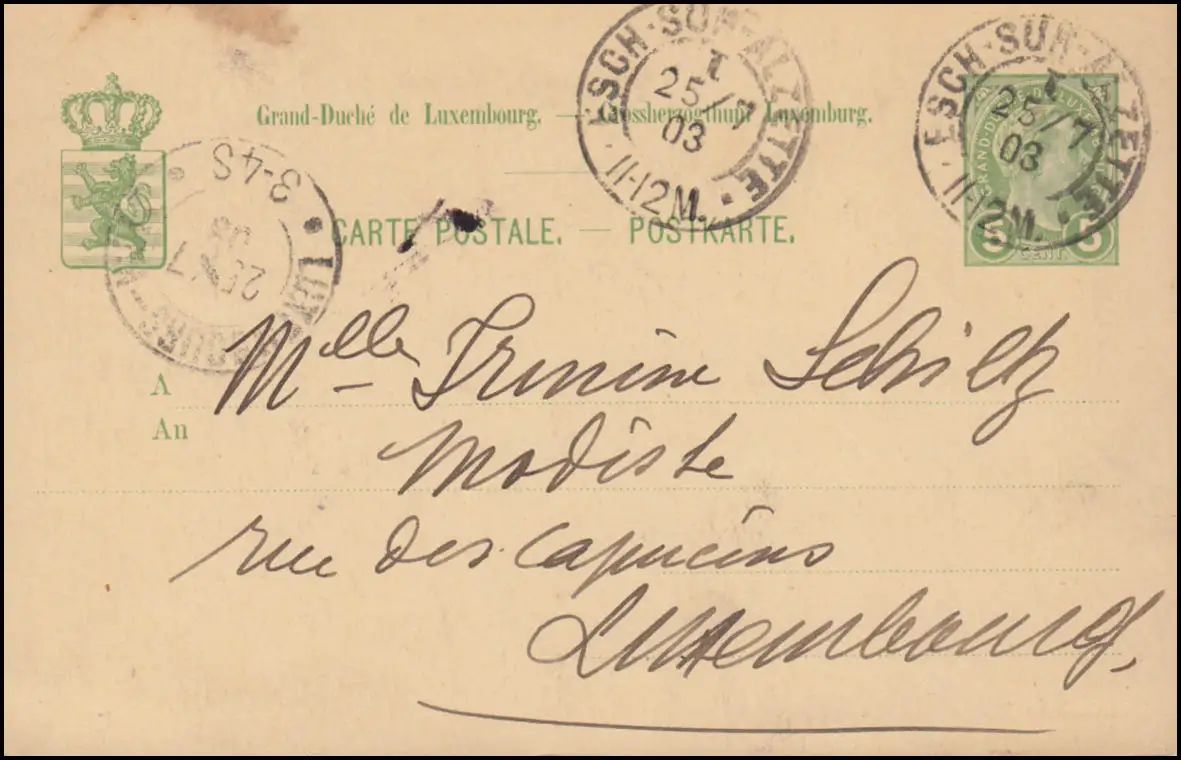 Luxembourg Carte postale P 57 ESCH-SUR ALZETTE 25.7.1903 vers LUXEMBOURG-VILLE 25.07.