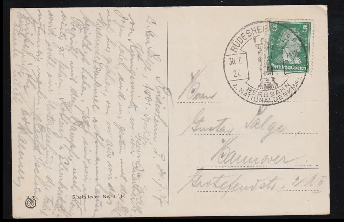Du roman du Rhin "Die Herrgoutschenke" par Jörg Ritzel / Peinture: Arc de Rolands sur la face des Sept Monts / Epic Drama Poem poèmes, Tampon spécial RÜDESHEIM (RHEIN) BERGBAHN au National DENKMAL 30.7.27 Examen: original Référence d'article: 00000000031454