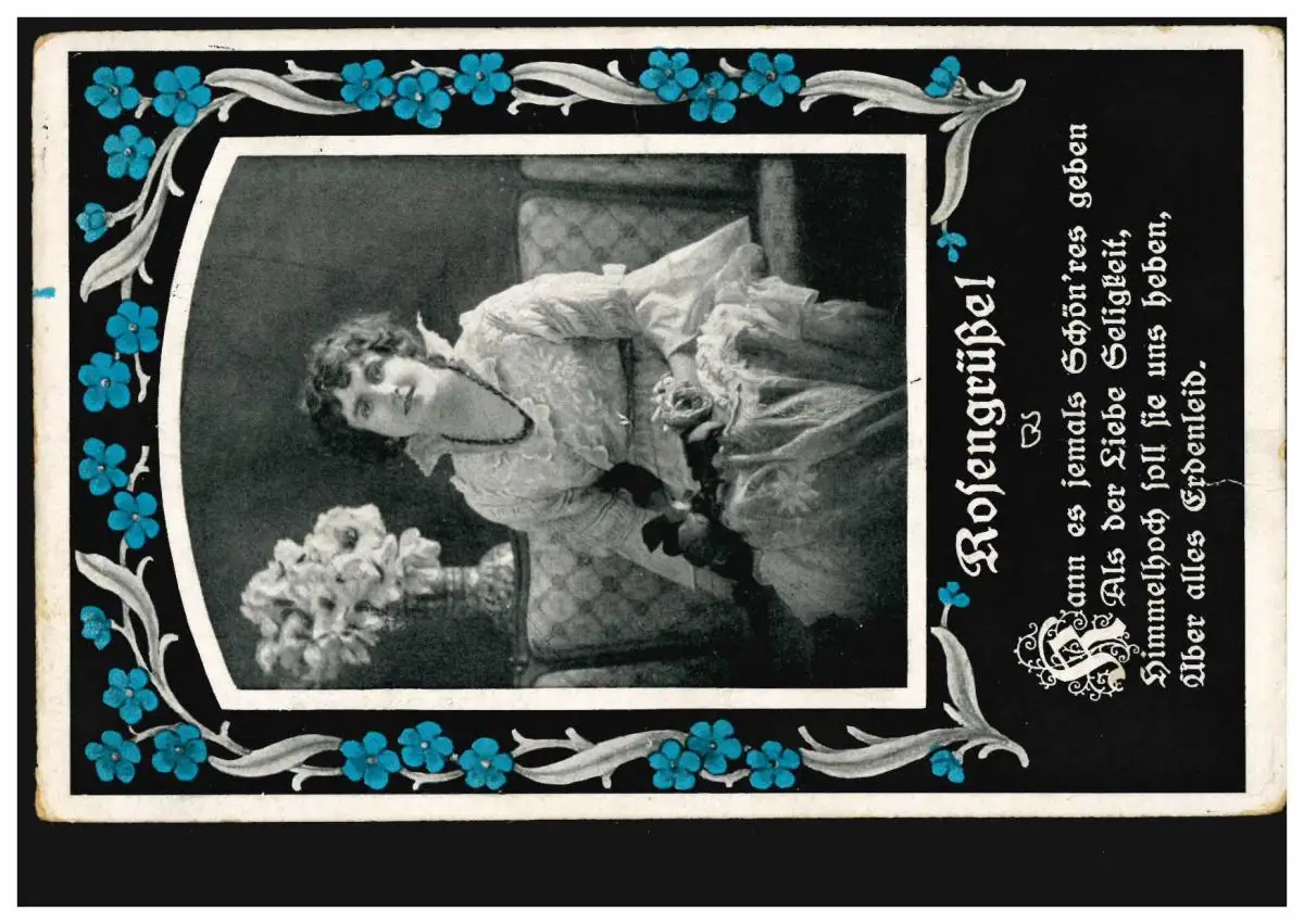 Lyrique AK femme avec rose sur le canapé, poème Rosensbonjour!, Post de champ 15.11.1916
