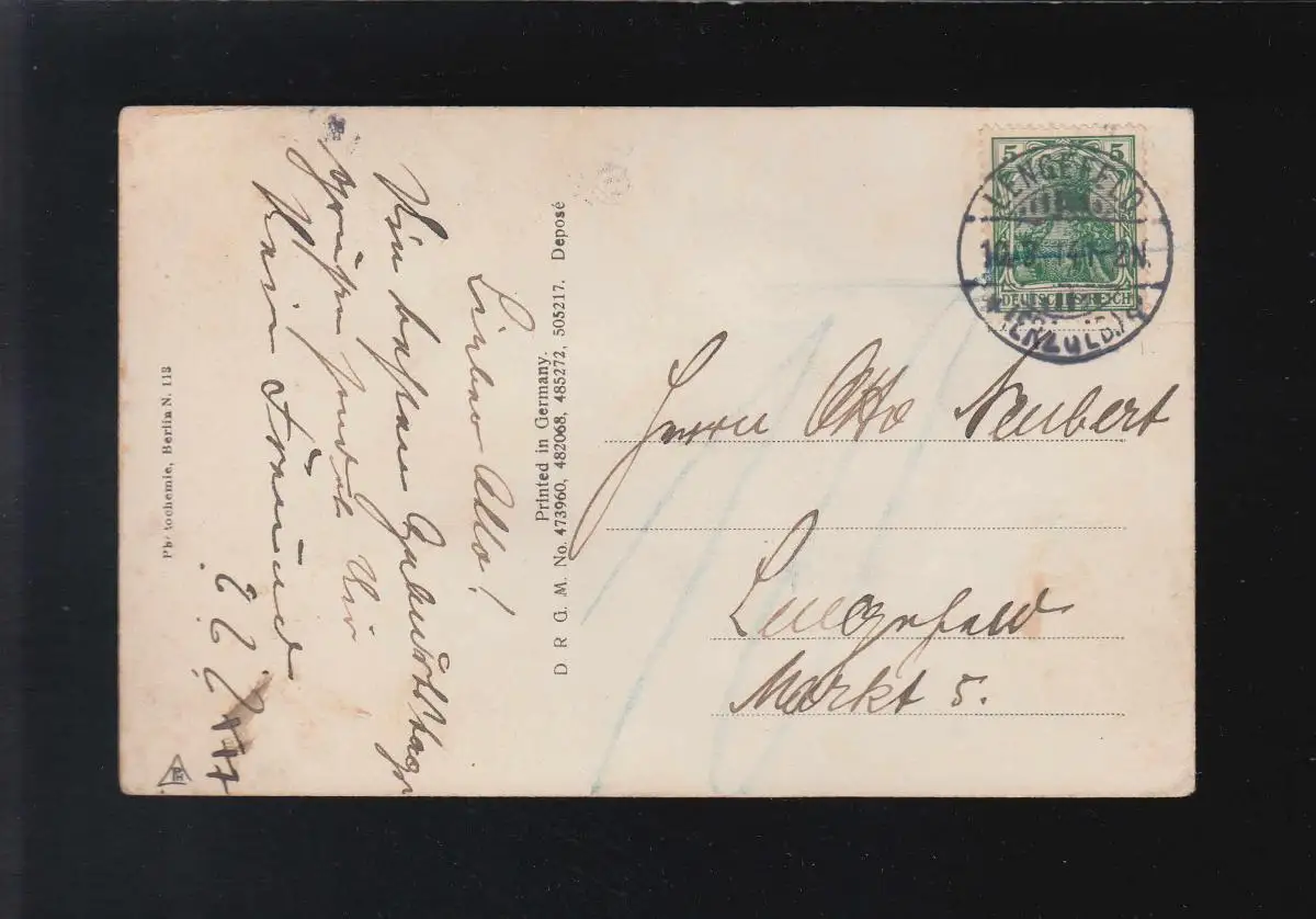 Mademoiselle Touche rouge avec fleurs, yeux bleus Veste verte feutre, Champ de ligne 10.8.1914
