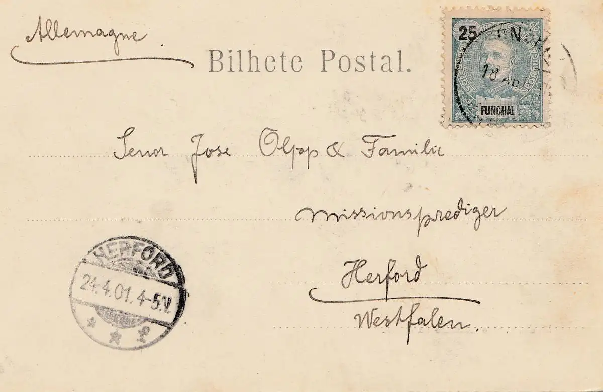 Madère: 1901: post card to Herford