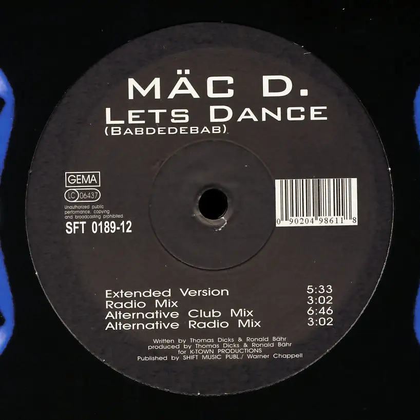 12" Maxi Mec D. - Lets Dance Babdedebab, unité de la société de disques, état plaque M- Hülle M; Fabriqué en Germany 2000 Shift Music SFT 0189-12, Tracks [Ext. Vers.] 5:33, [Radio Mix] 3:02, (Alternative Club Mix) 6:46,[Alternative Radio Mix ] 3:03