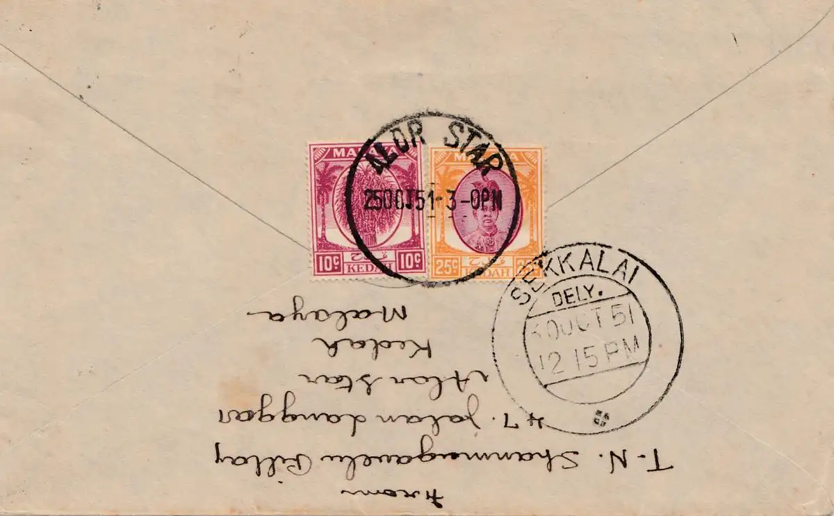 Malaisie: 1951: air mail Alor Star to Sekkalai/Delhi
