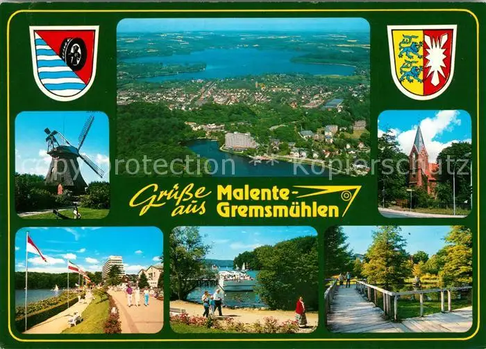 Malente-Gremsmuehlen Fliegeraufnahme Muehle Kirche Strand Schiffsanleger Malente-Gremsmuehlen postalisch nicht gelaufen nach 1965 Erhaltung siehe scans [WerneD78] WernPID7