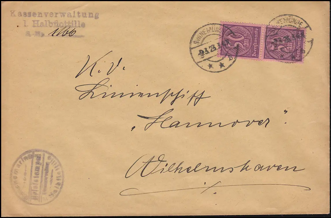 De la gestion de caisse de la 1ère demi-flotttière avec timbre de lettre marine à la direction de trésorerie du navire ligne "Hannover" à Wilhelmshaven. N° de catalogue: D73 Examen: original Numéro d'article: 00000000030151