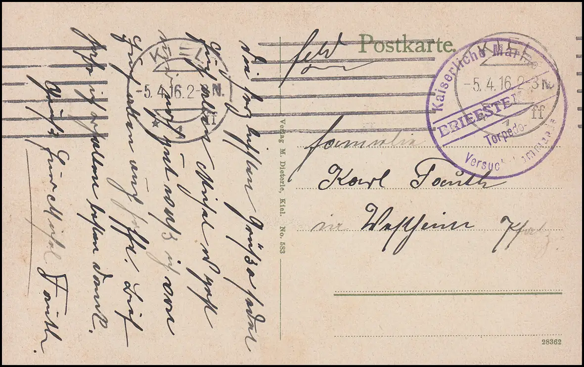 Marinefeldpost BS Tampedo-Station d'essai, timbre machine KIEL 5.4.16 sur AK