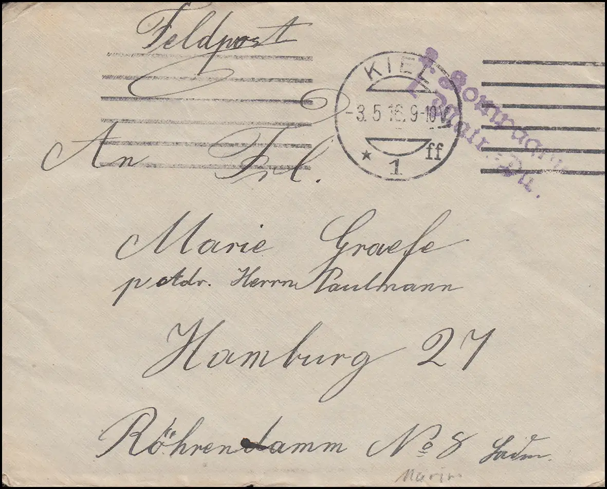 Marinefeldpost Bizeierer BS 2ème compagnie 1ère division de marins, lettre KIEL 3.5.16