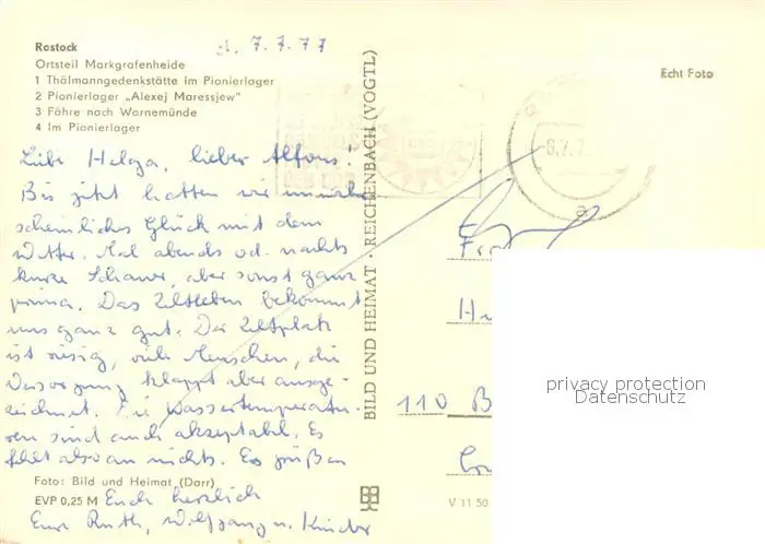 Markgrafenheide_Rostock Thaelmanngedenkstaette im Pionierlager Alexej Maressjew Faehre nach Warnemuende Pionierlager Markgrafenheide_Rostock postalisch gelaufen 1977 Erhaltung siehe scans [WerneD78] WernPID7