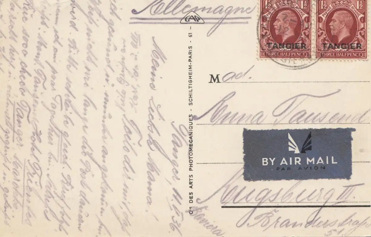 Maroc 1936: post card Tanger to Augsburg via air mail