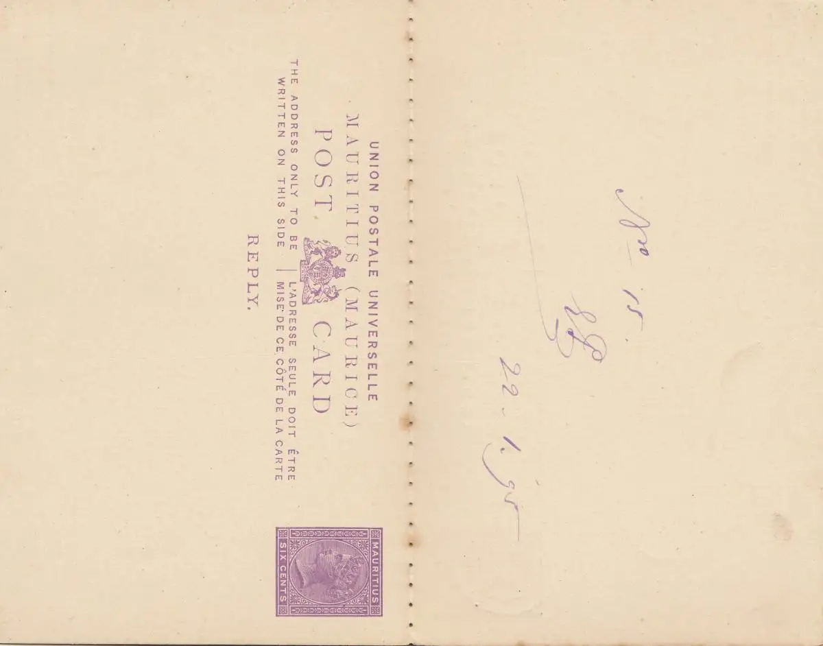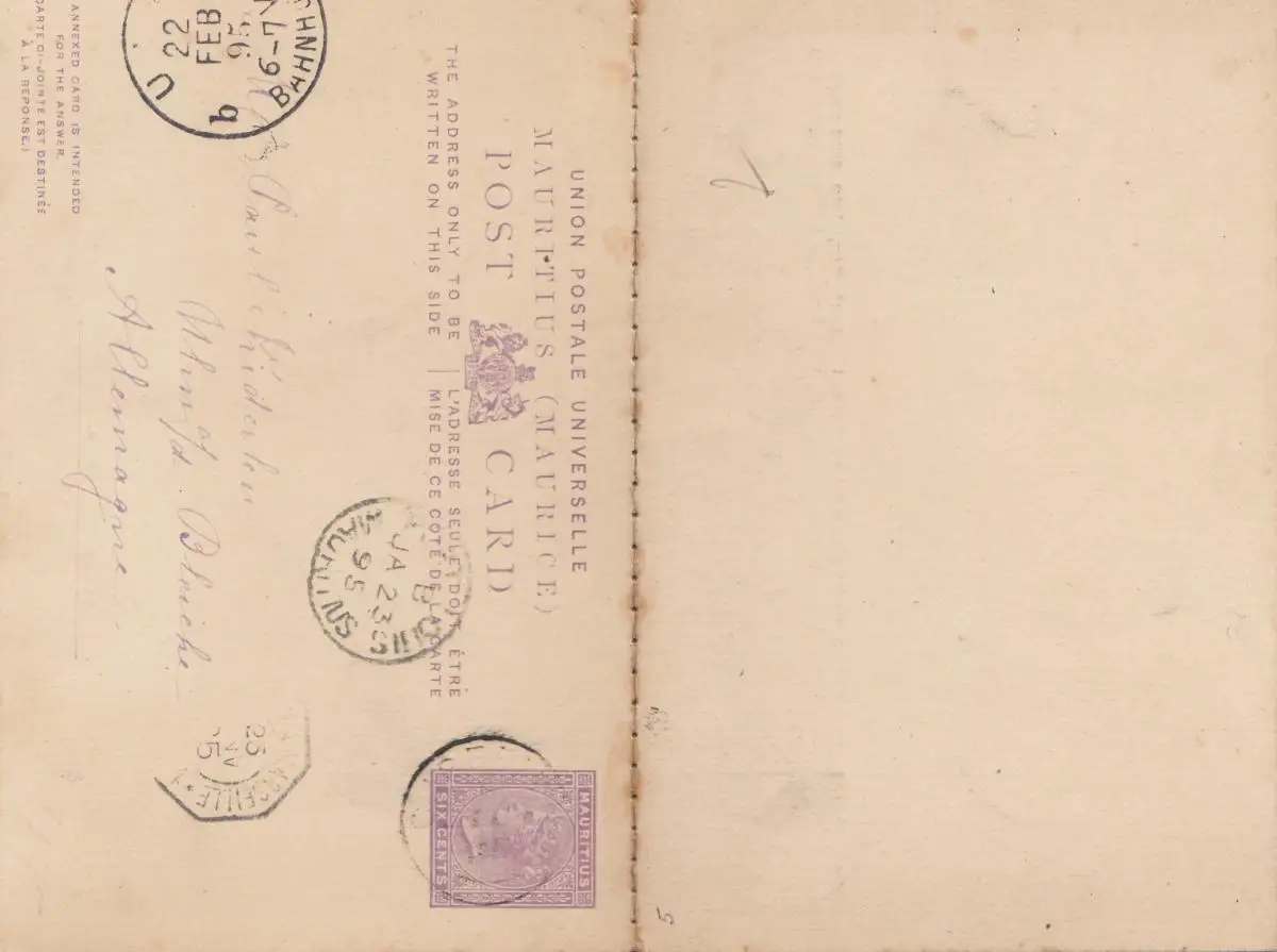 Maurice: 1895: post card to Ulm/Germany