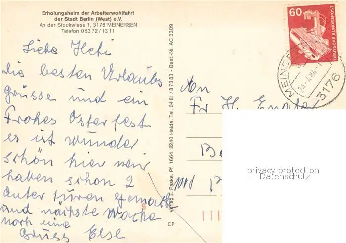 Meinersen Heidehaus Kaminzimmer Erholungsheim der AWO der Stadt Berlin Meinersen postalisch gelaufen 1984 Erhaltung siehe scans [FriedD77] Frierer