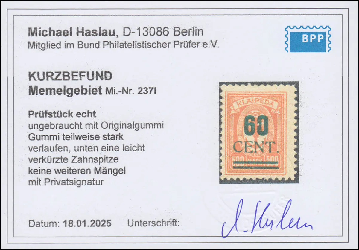 Memel 237 I Aufdruckmarke 60 Cent. - Befund Haslau ungebraucht *